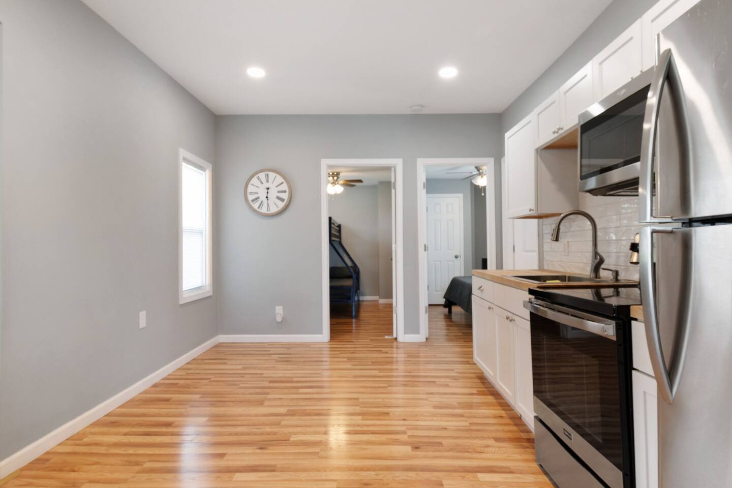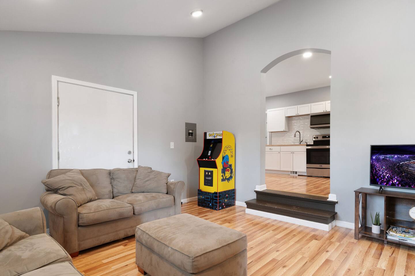 This is a spacious 3-bedroom apartment with 4 beds (1 queen, 2 fulls and 1 single) and 1 bathroom. There is a beautiful kitchen with a stove, microwave and fridge. Kids will love the arcade games and the apartment is within walking distance of Niagara Falls State Park, Seneca Casino and everything downtown.